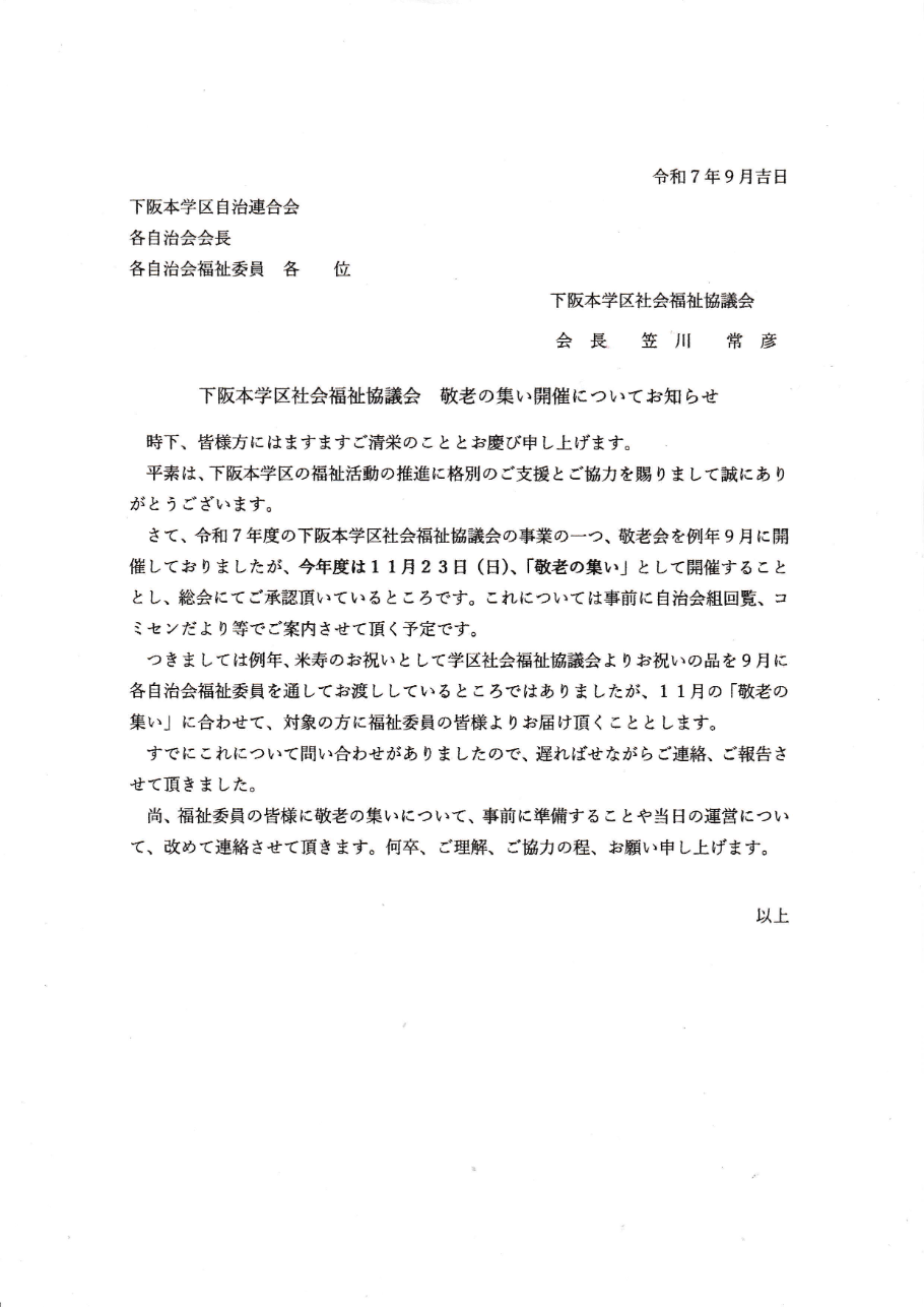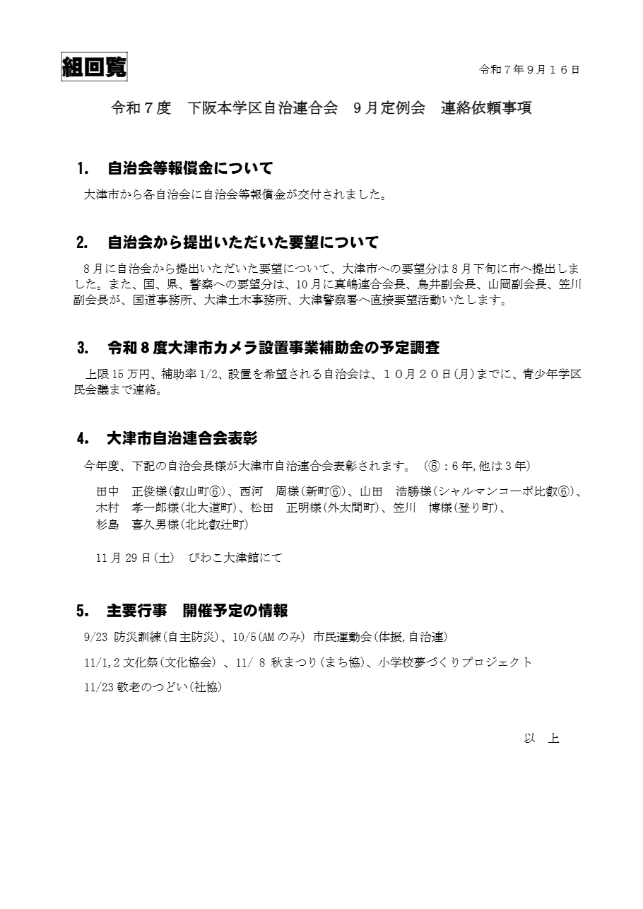 下阪本学区自治連合会 9月定例会