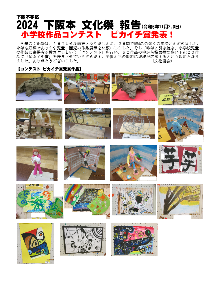 今年の文化祭は、1日目大きな雨天となりましたが、2日間で584名の多くの来場いただきました。今年も好評であります児童・園児の作品展示をお願いし、皆さんに喜んでいただきました。また特別展として山王祭で使われている甲冑を展示し、その前で日吉鼓童の太鼓演奏と山王祭下阪本駕輿丁が伊勢歌を披露して頂き、祭りの雰囲気を演出していただきました。健推カフェでは、「ほっこりする」気分でコーヒーと懐かしい話で楽しんでいただきました。 (文化協会)