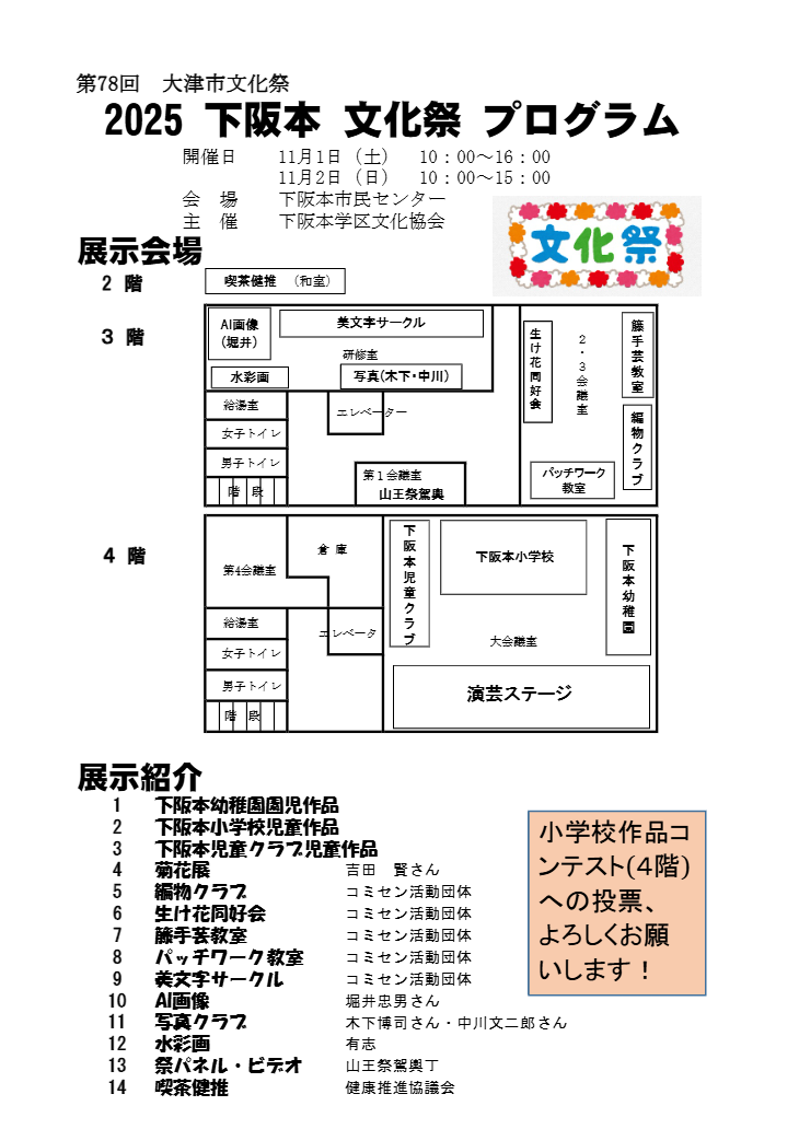 /★下阪本文化祭(11月1日(土),2日(日),市民センター)を開催します。