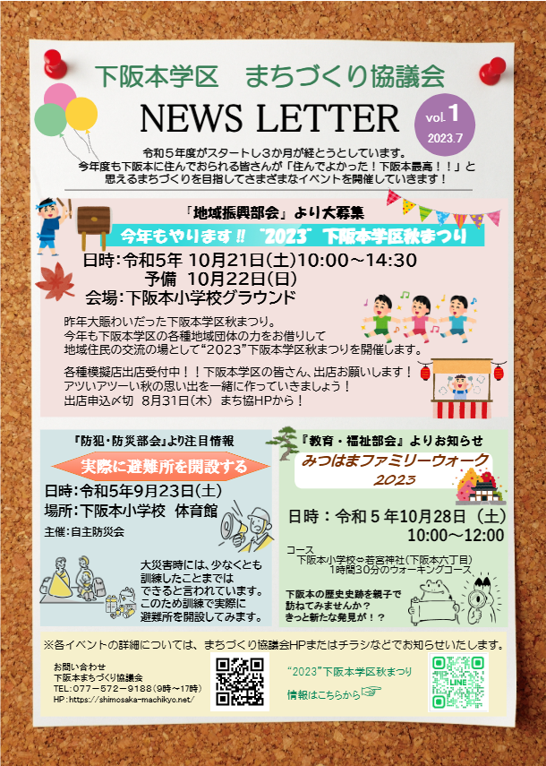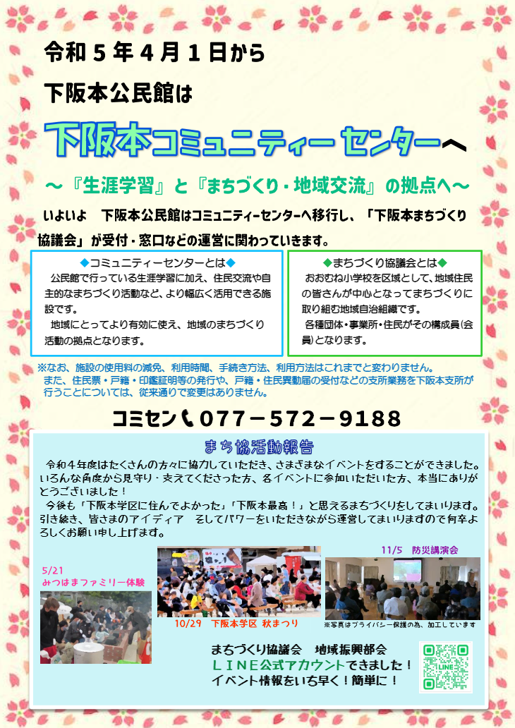 「下阪本学区まちづくり協議会」は、地域のために活動される皆様をサポートし、情報交換をしながら『つなぐ』役目を果たしています。