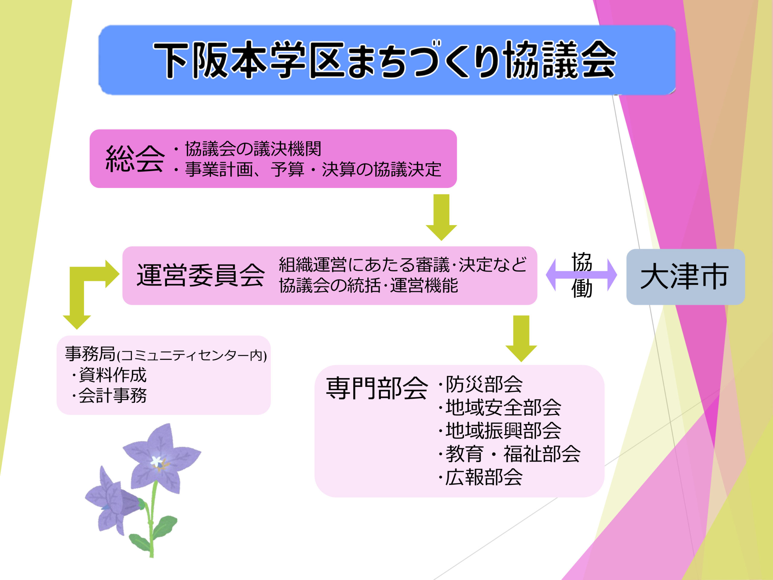 下阪本のさまざまな課題に対応できる『新しい仕組みづくり』、『持続可能なまちづくり』を目指します。